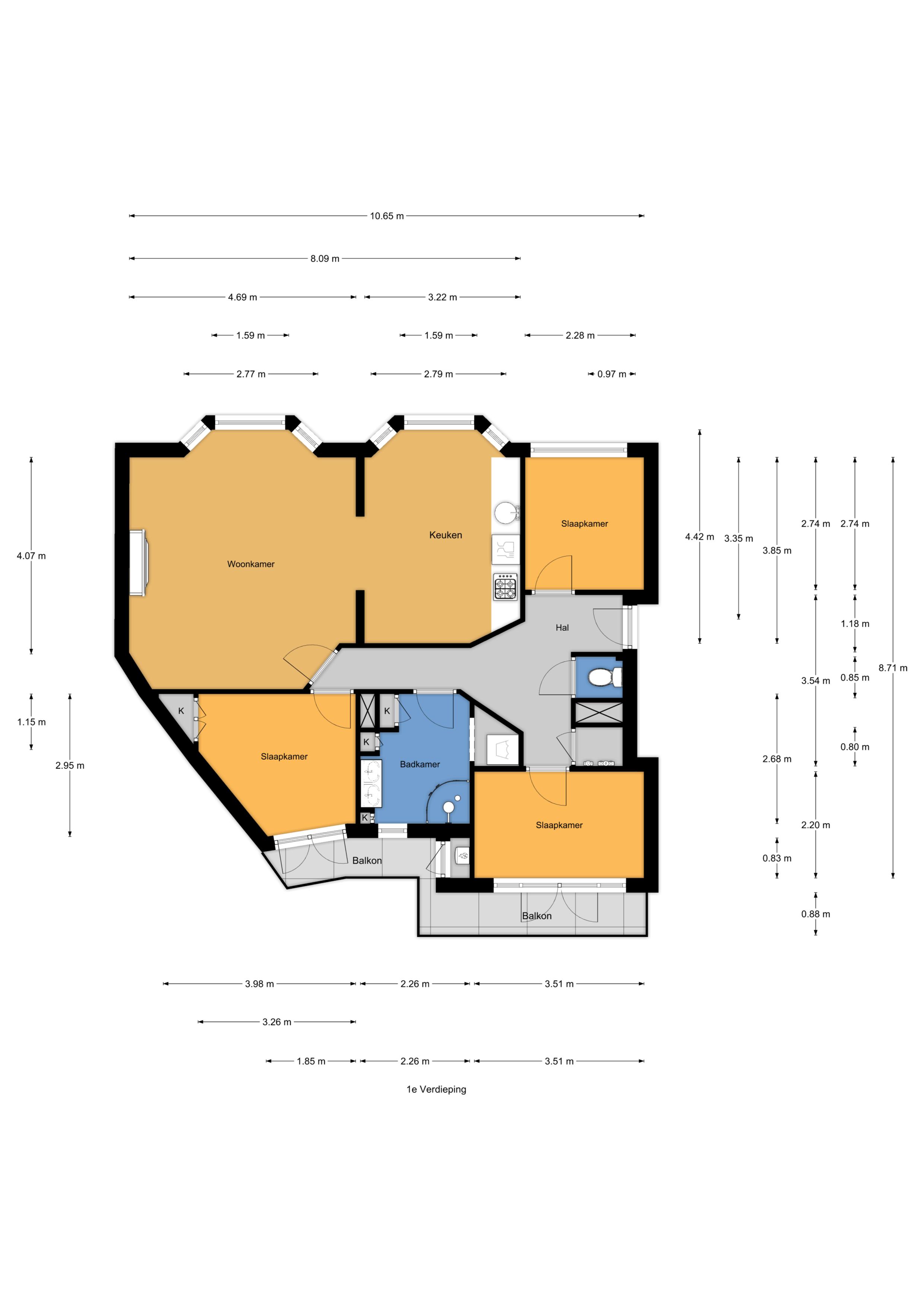Portiektrap naar de eerste etage; entree woning; ruime hal met vaste kast; net geheel betegeld toilet; ruime woonkamer met keurige nette open keuken met keukenblok met onder - en bovenkasten, natuurstenen aanrechtblad, gascomfort, afzuigkap, vaatwasser, oven/magnetron, koelkast en vriezer; drie slaapkamers waarvan twee met balkon; keurige geheel betegelde badkamer met douchecabine, dubbele wastafel, handdoekdroger/designradiator en wasmachine-aansluiting. (Volledige afmetingen op de laatste foto!)