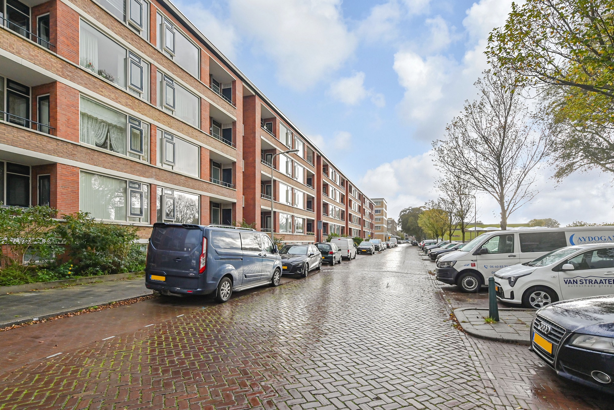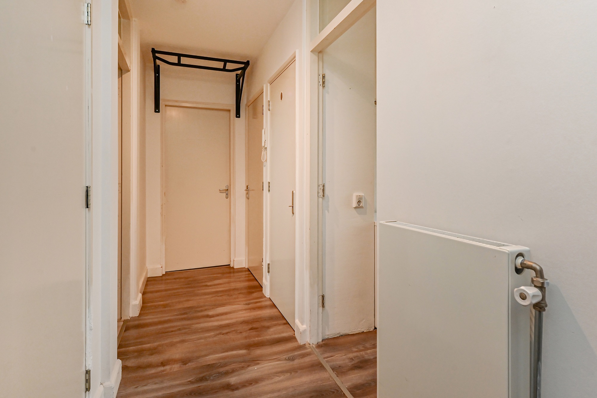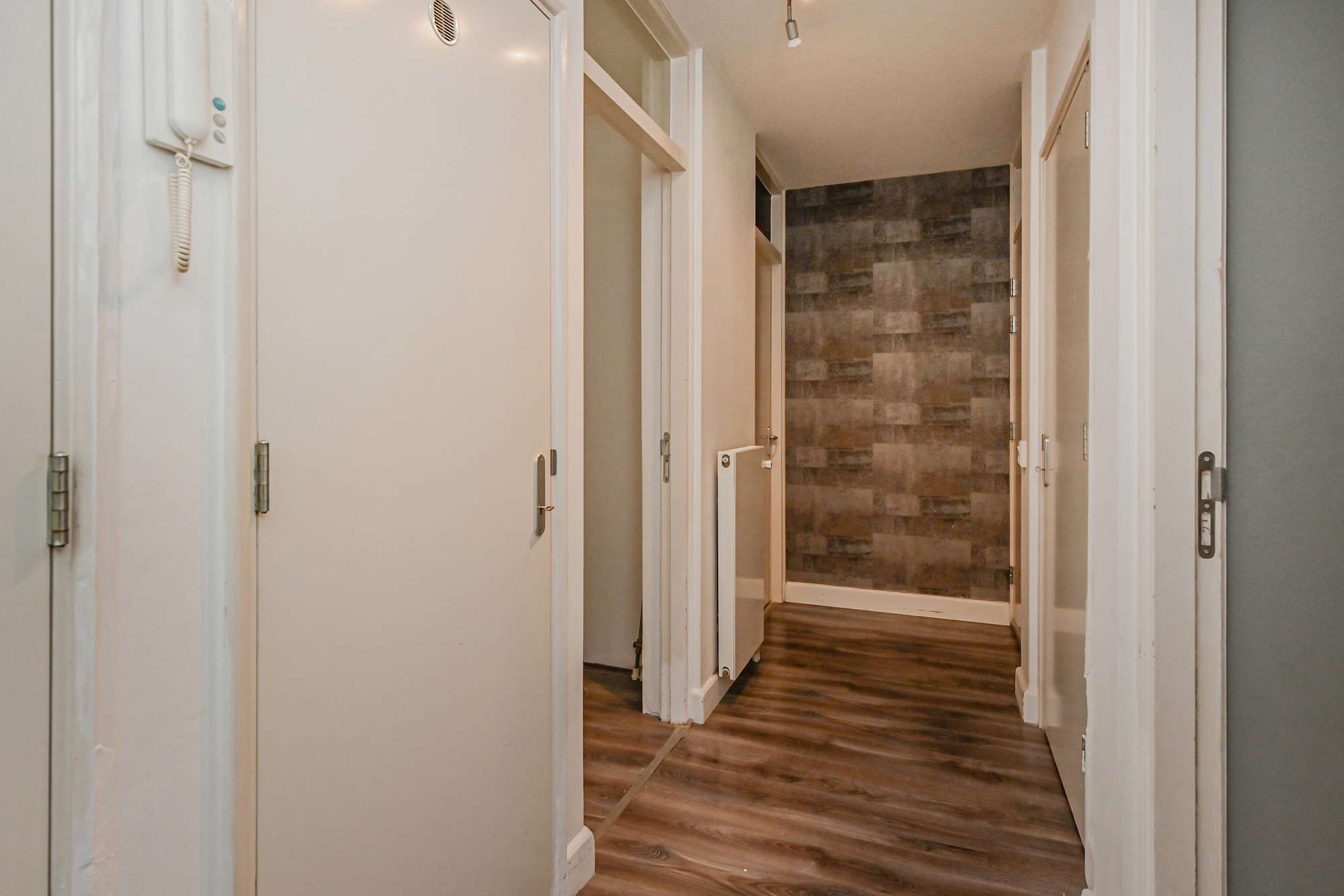 Gemeenschappelijke entree op de begane grond met intercominstallaties en brievenbussen; trap naar de vierde etage; entree woning; hal met vaste kast en meterkast; toilet met wandcloset en fonteintje; ruime woonkamer/eetkamer waar eventueel een derde slaapkamer is te maken; via de woonkamer toegang tot het voorbalkon; via openslaande deuren aan de achterzijde van de woonkamer toegang tot het achterbalkon; achterbalkon met balkonkast; twee slaapkamers; keuken met onder - en bovenkasten, diverse inbouwapparatuur en wasmachine-aansluiting; badkamer met doucheruimte en vaste wastafel; zeer ruime berging met elektra in de onderbouw. (Volledige afmetingen op de laatste foto's!)