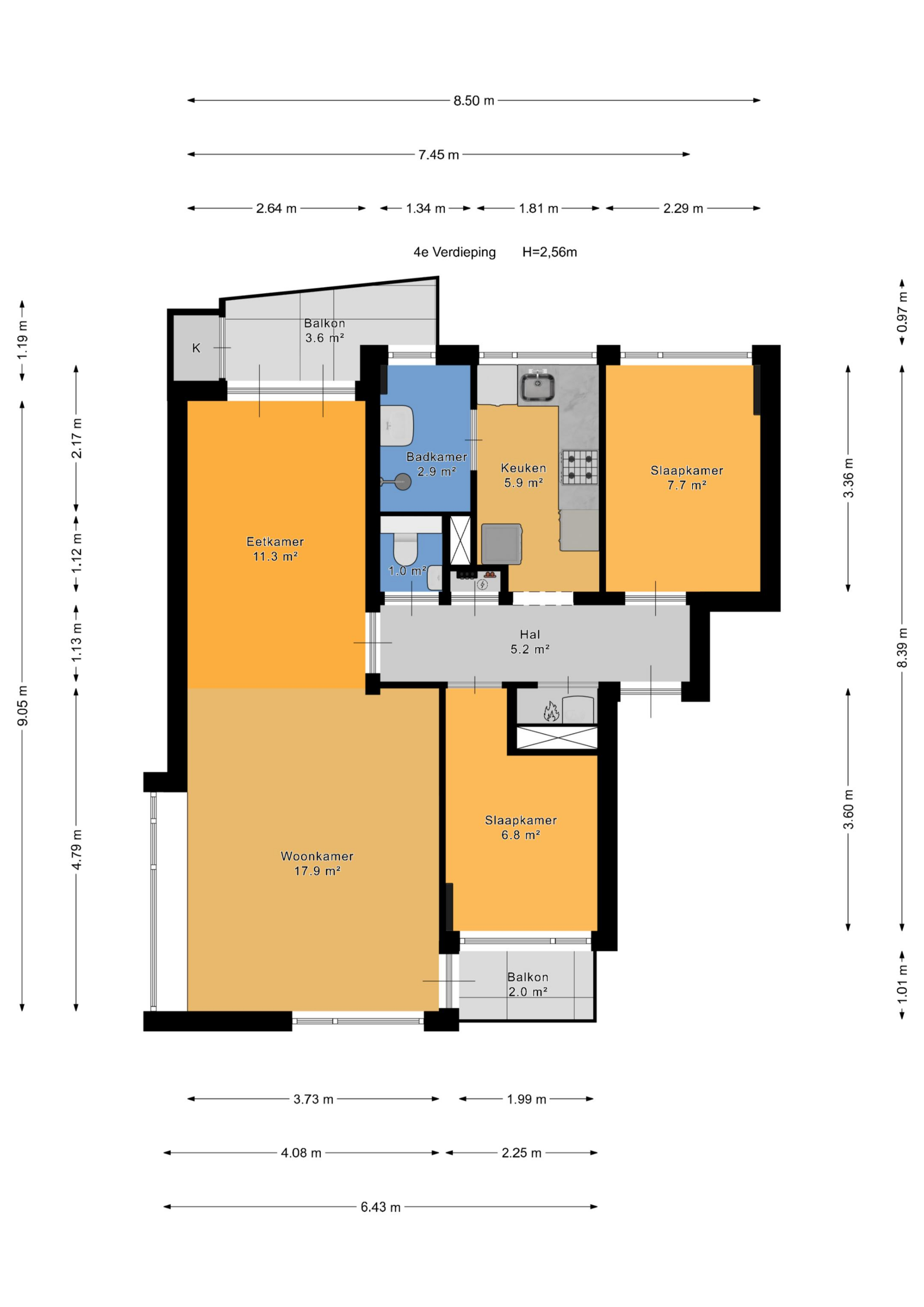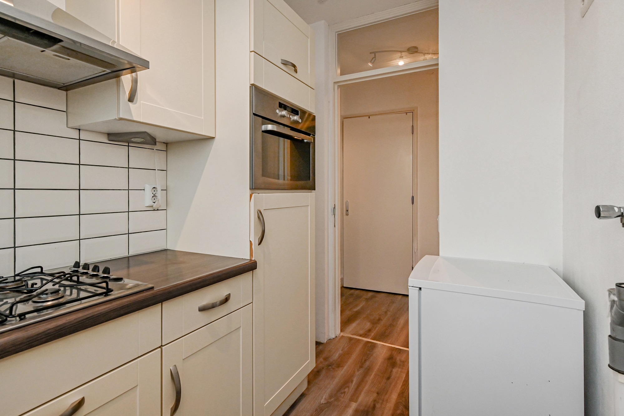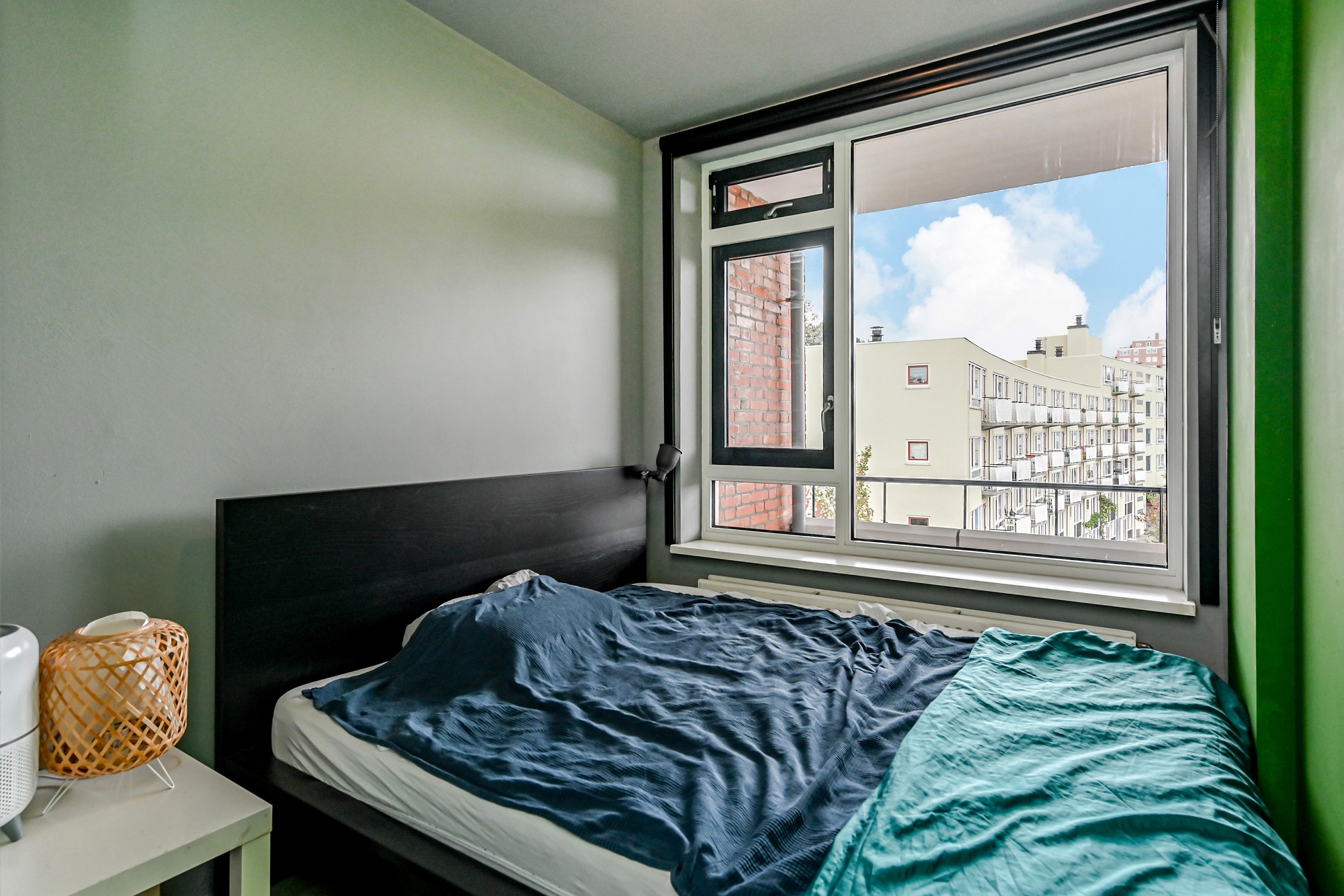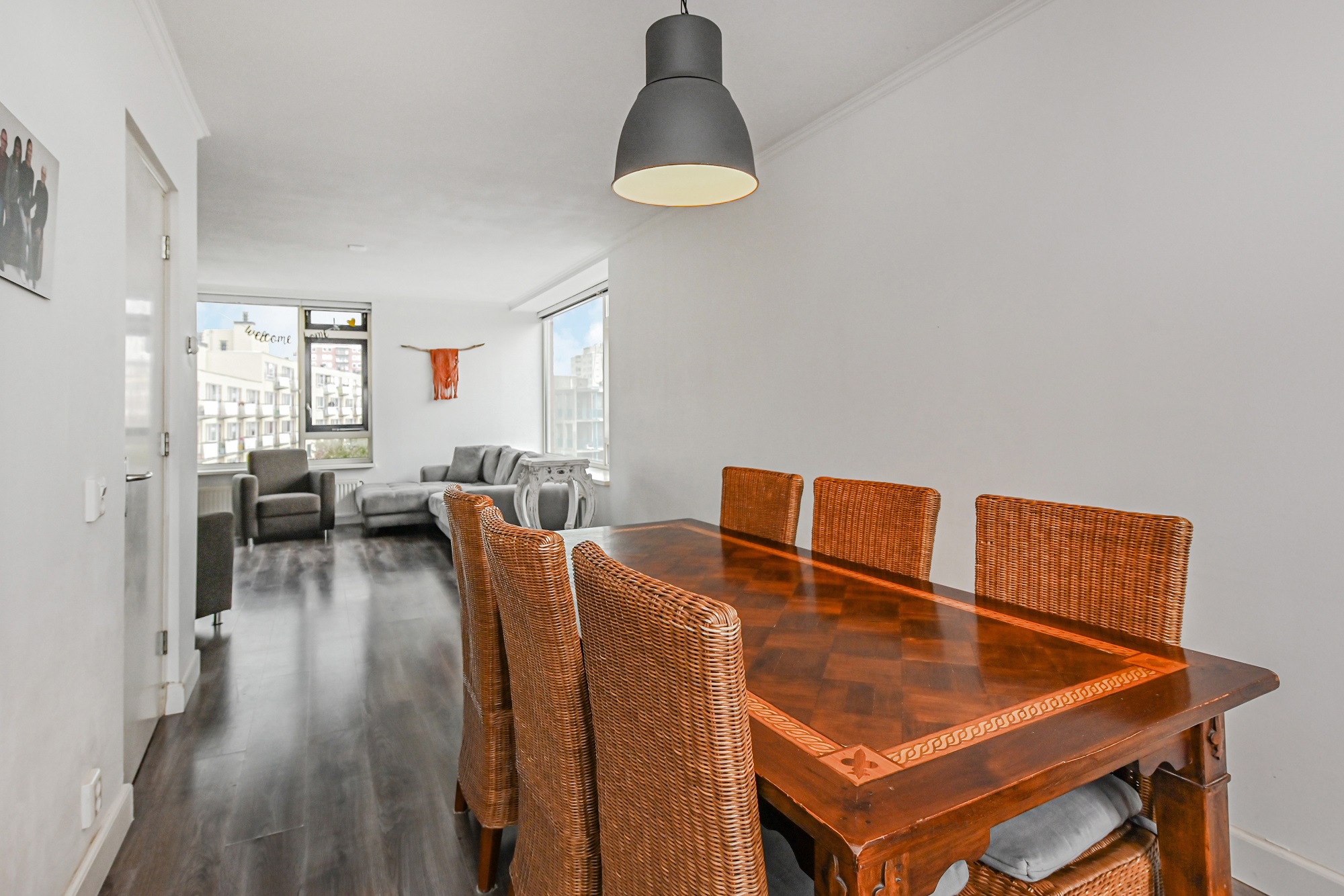 Gemeenschappelijke entree op de begane grond met intercominstallaties en brievenbussen; trap naar de vierde etage; entree woning; hal met vaste kast en meterkast; toilet met wandcloset en fonteintje; ruime woonkamer/eetkamer waar eventueel een derde slaapkamer is te maken; via de woonkamer toegang tot het voorbalkon; via openslaande deuren aan de achterzijde van de woonkamer toegang tot het achterbalkon; achterbalkon met balkonkast; twee slaapkamers; keuken met onder - en bovenkasten, diverse inbouwapparatuur en wasmachine-aansluiting; badkamer met doucheruimte en vaste wastafel; zeer ruime berging met elektra in de onderbouw. (Volledige afmetingen op de laatste foto's!)