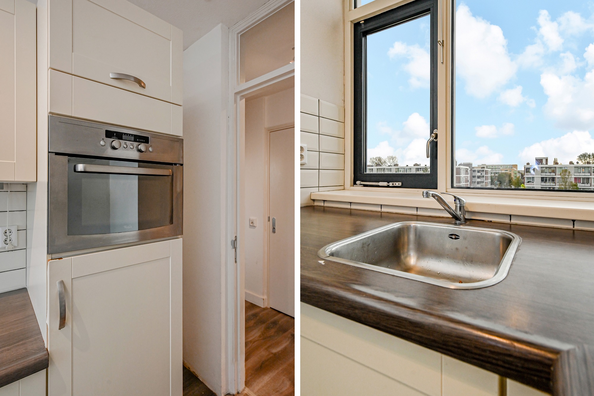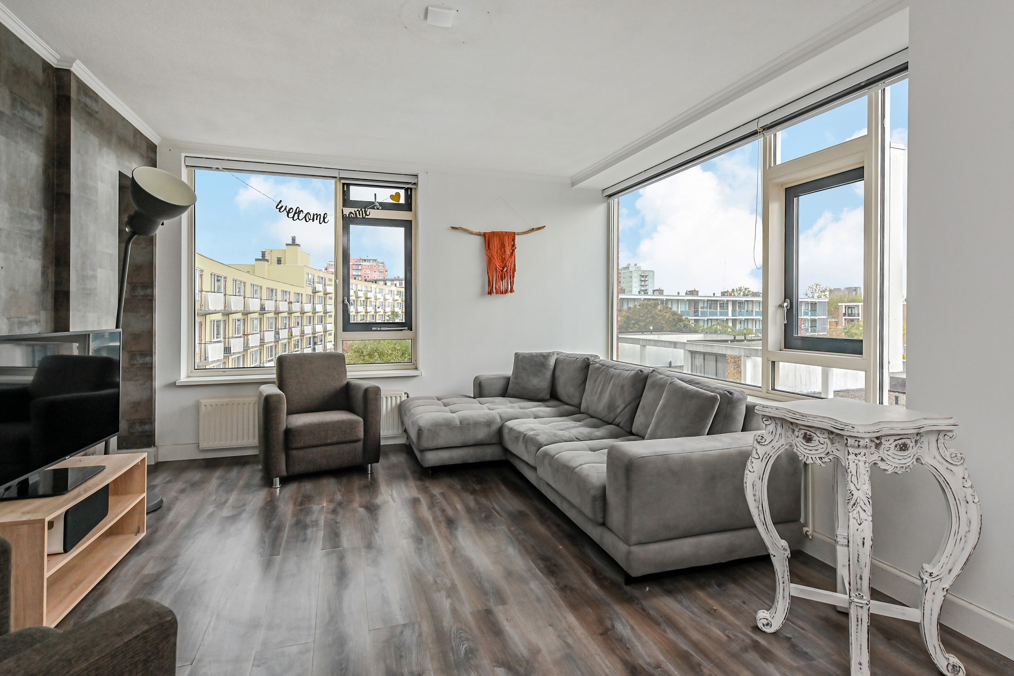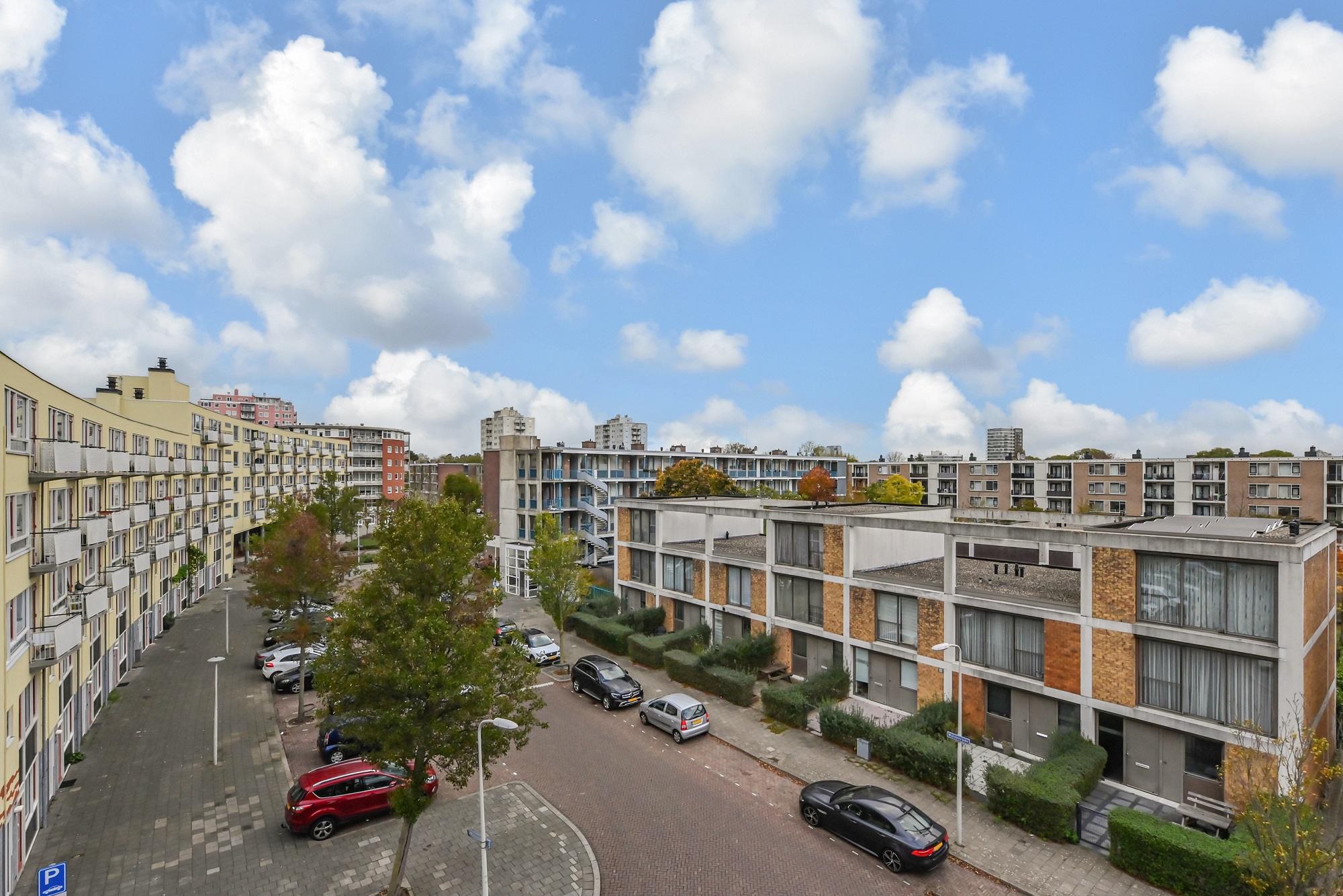 Op een hoek gelegen drie/vierkamer topetage met een voor - en achterbalkon en een zeer ruime berging in de onderbouw! Door de hoekligging extra veel lichtinval! Prachtig vrij uitzicht!